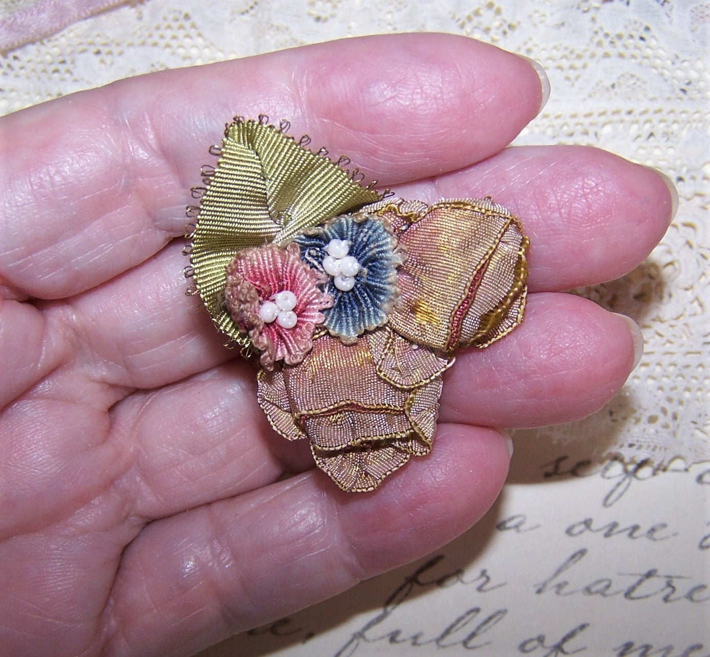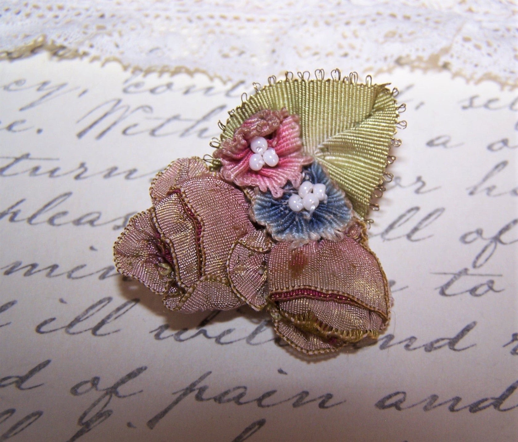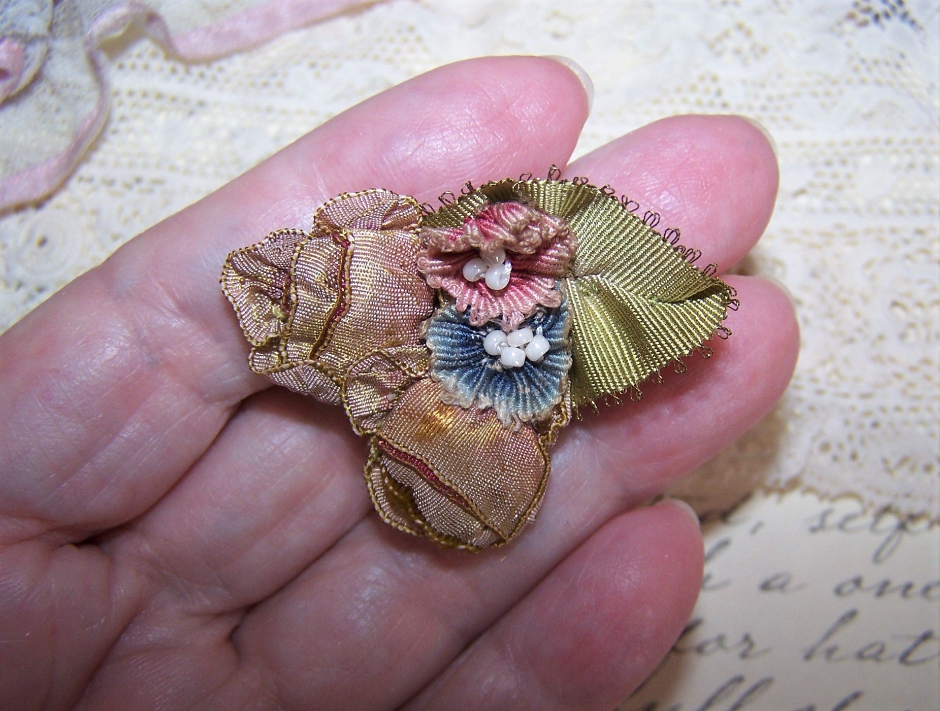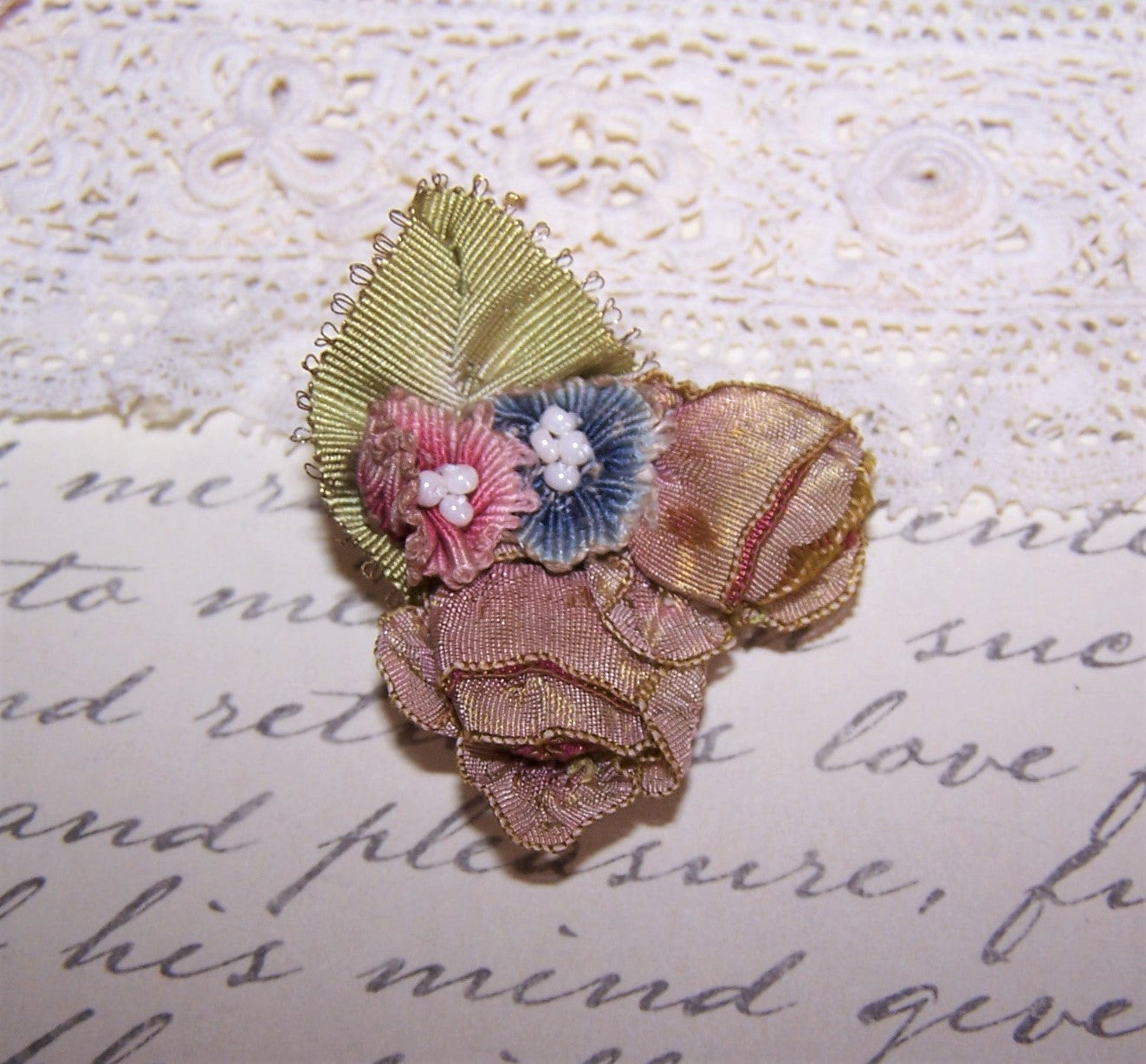 From an old coverlet I found and needing only a few modern touches to bring it back to like, may I offer this 1930s Art Deco French Ribbonwork applique. Composed of 2 maroon coiled roses, the accent florals appear to be blue ombre and red ombre cotton. The center of each is filled with cream colored seed beads. A wired edge green leaf completes the creation. Size is 1-3/4" x 1-1/2". Entirely hand sewn with a crinoline backing. To attach to your favorite piece, either sew on or add a pin to the back - this way, the piece can be detached before your item is cleaned. The ribbon bouquet is quite secure now and is in no danger of falling apart. So hard to find, a true vintage piece of French ribbon artistry.