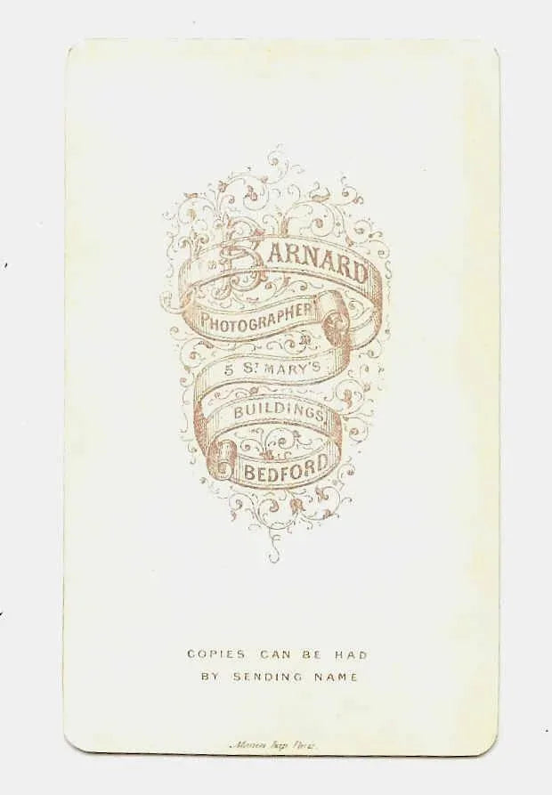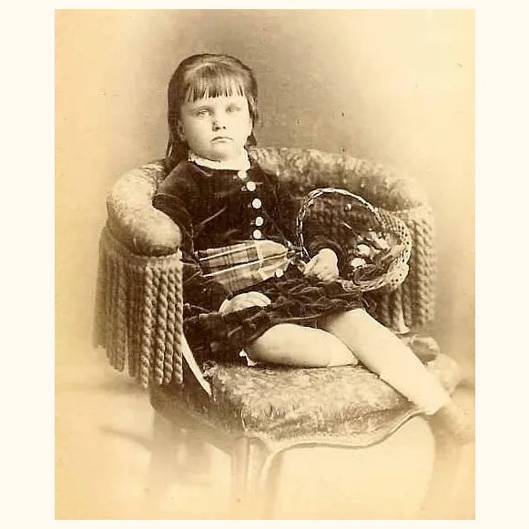 Dating to the 1890s or so, here's an Antique Victorian cabinet card photograph depicting a young girl resting in a chair. The child appears to be dressed in a velvet outfit with a tartan sash - in her left arm she carries a basket of flowers. Card measures 2-1/2" x 4" and was taken by M. Barnard, Photographer, St. Mary's, Bedford UK. Adorable image!