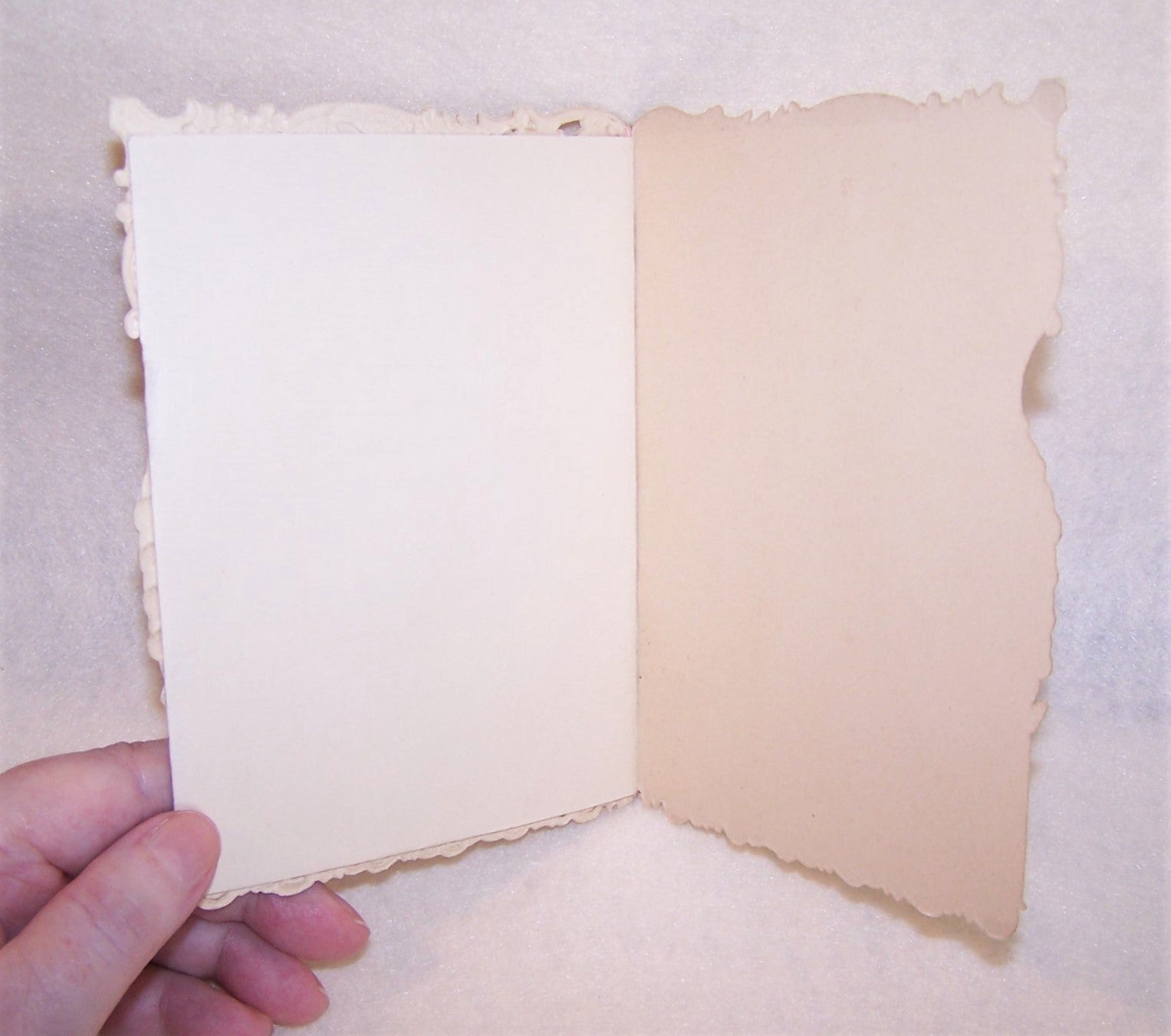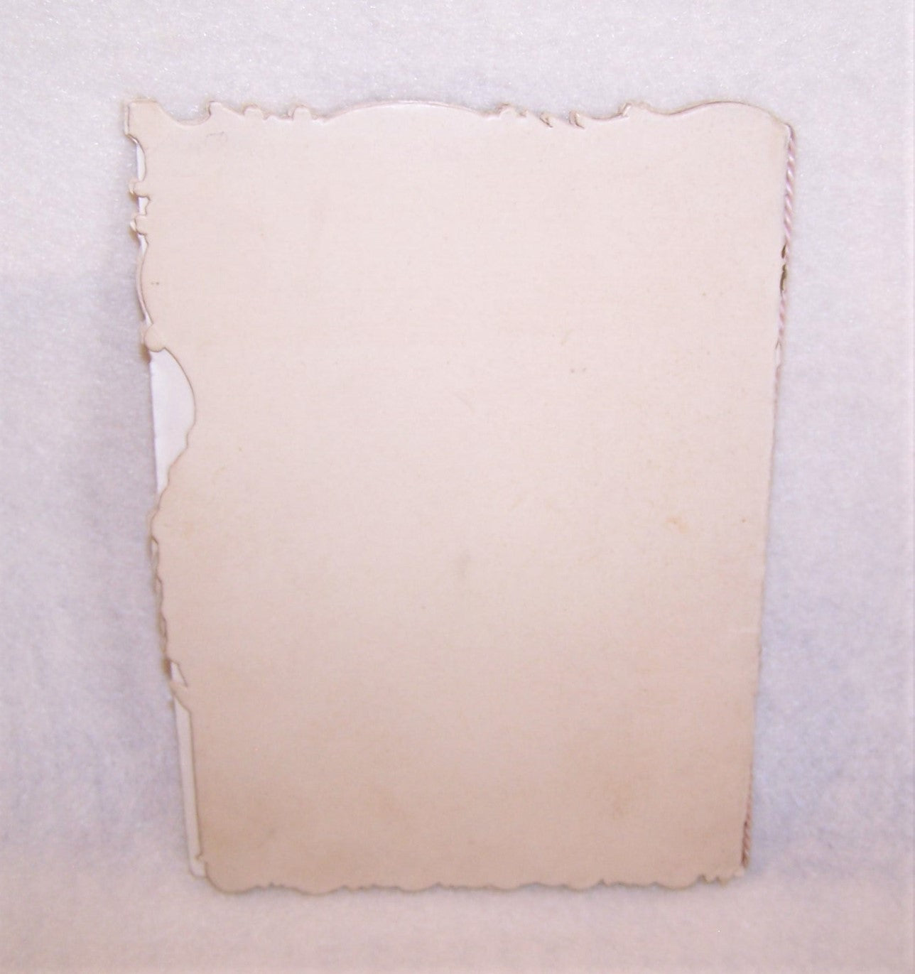 Dating to the 1890s or so, here's an adorable Victorian era Greeting Card! The card is heavily embossed with pink roses sitting in a bridal basket. The card is entitled HEARTY GREETINGS and when you lift the cover, you will see the original paper leaflet that begins with "With Love and Kindest Regards". Size, when closed is 6" x 4-1/2" approx. The card is meant to be gifted to a loved one, a Sweetheart or Fiance I Think. The original cording is present. No makers marks. Very fine condition for its age though where the paper peeks out from the right side of the cover, there is a bit of rumpling in that area. There is no envelope but I will try to find one before sending; if I can't, please forgive.