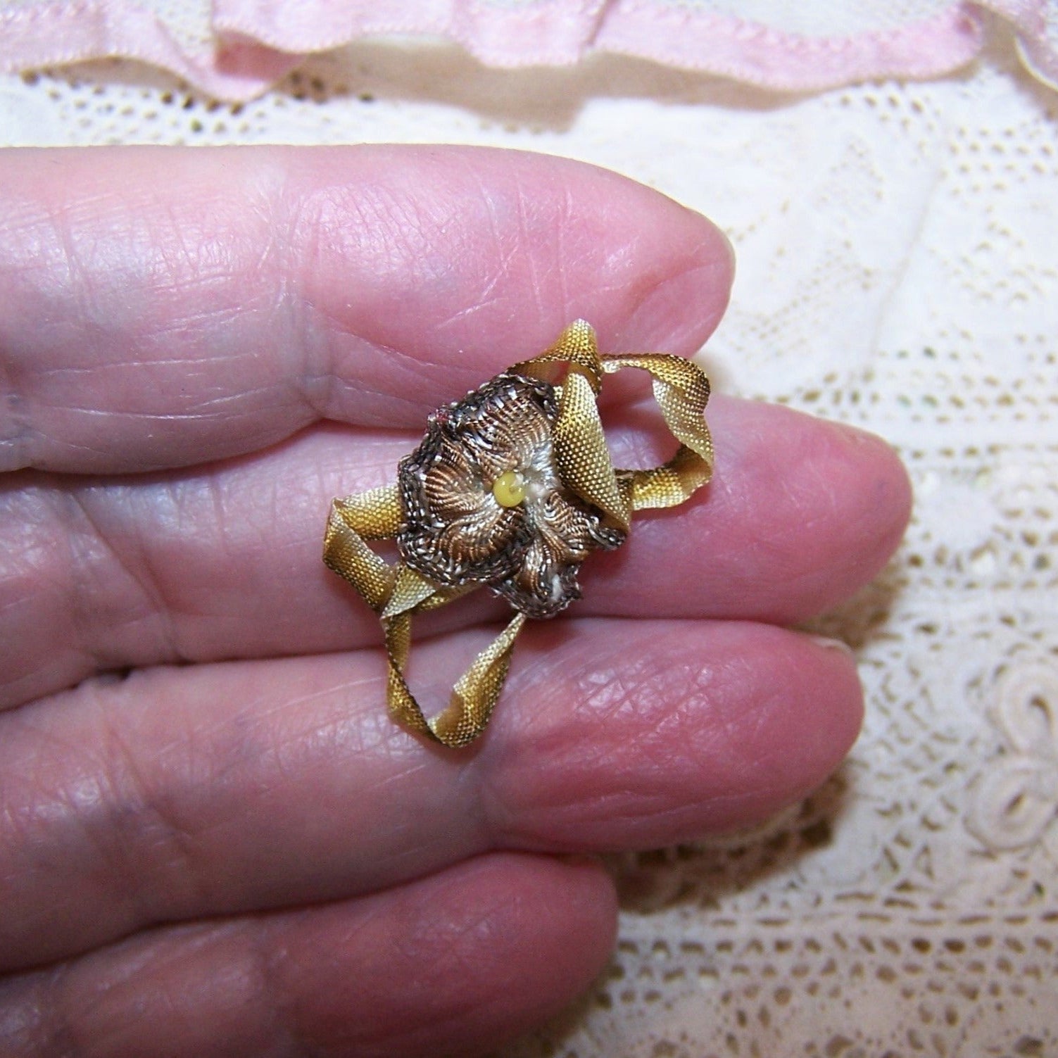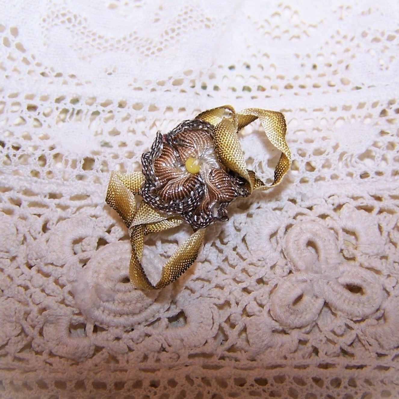 From an old Art Deco era French coverlet, here's a single Mustard Yellow ombre ribbon floral set with a single yellow glass seed bead at the center. With ochre ombre loopy leaves, the ribbon piece measures 1" wide (loopy end to end) x 9/16" high. The floral alone measures 1/2" x 1/2". Entirely hand sewn on crinoline. Just a small piece that I am sure can be used on a piece of dolls clothing.