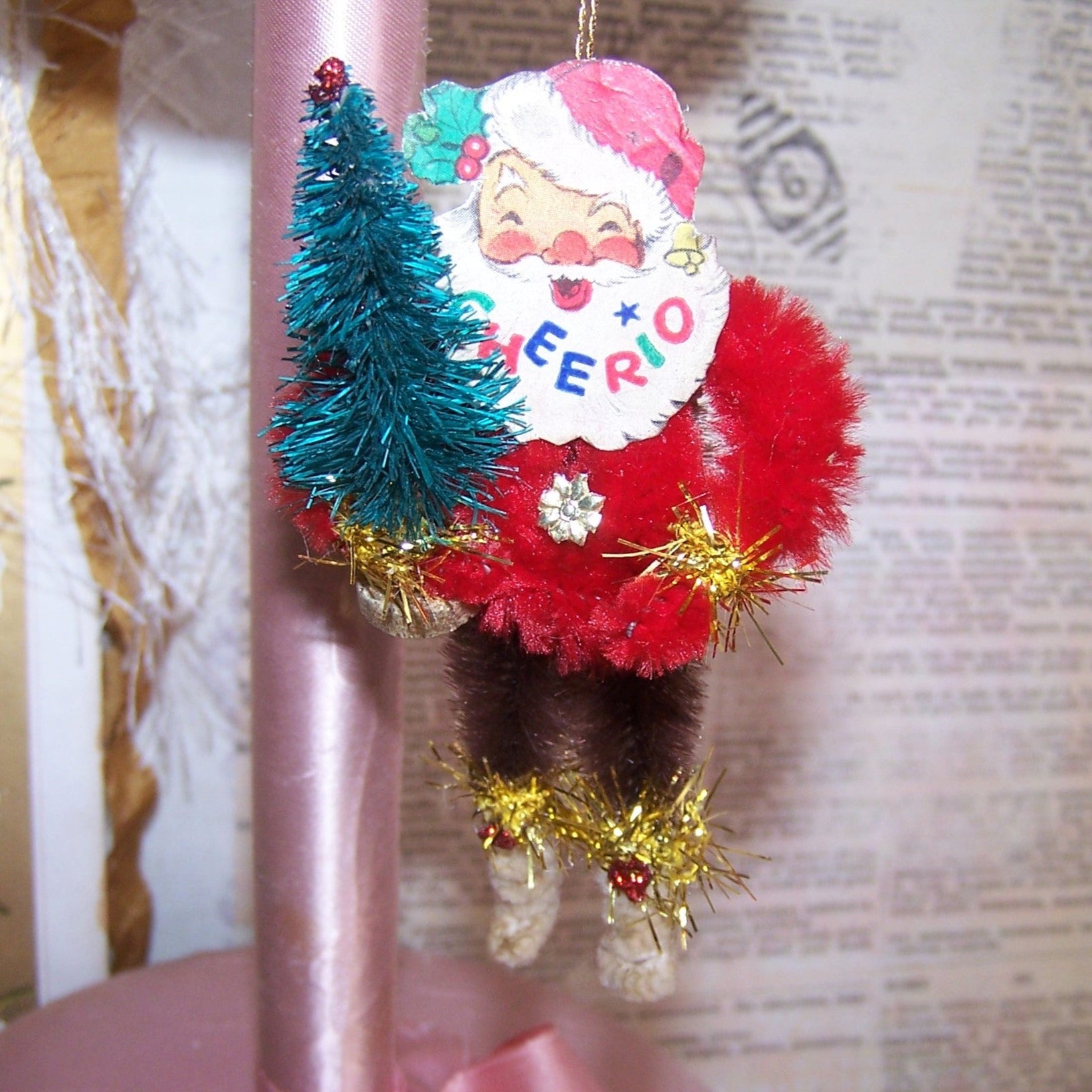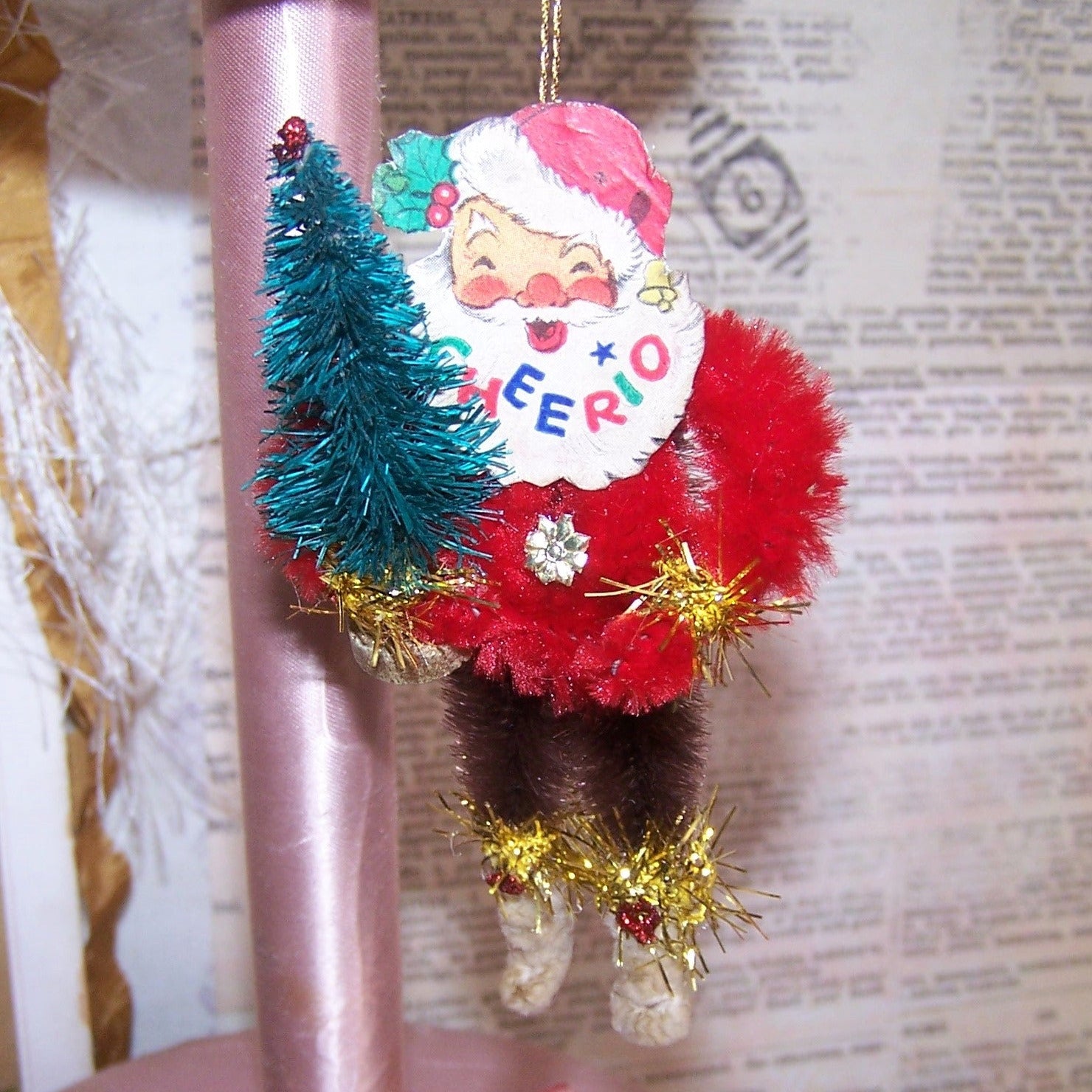 Hand made by me here's a ONE OF A KIND Santa Claus Christmas ornament. Made of chenille, Santa sports a 1950s Christmas sticker face (sentiment written is CHEERIO) and holds a bottle brush Christmas tree. Gold tinsel and Dresden Paper add a touch of embellishment to the piece. Height is 4"; width is 2". Very lightweight, perfect for a feather tree. Again, OOAK!