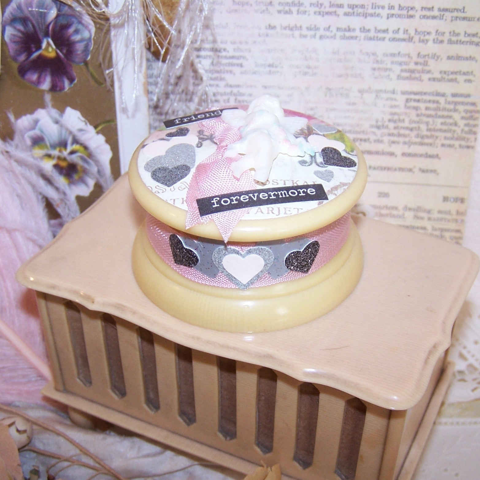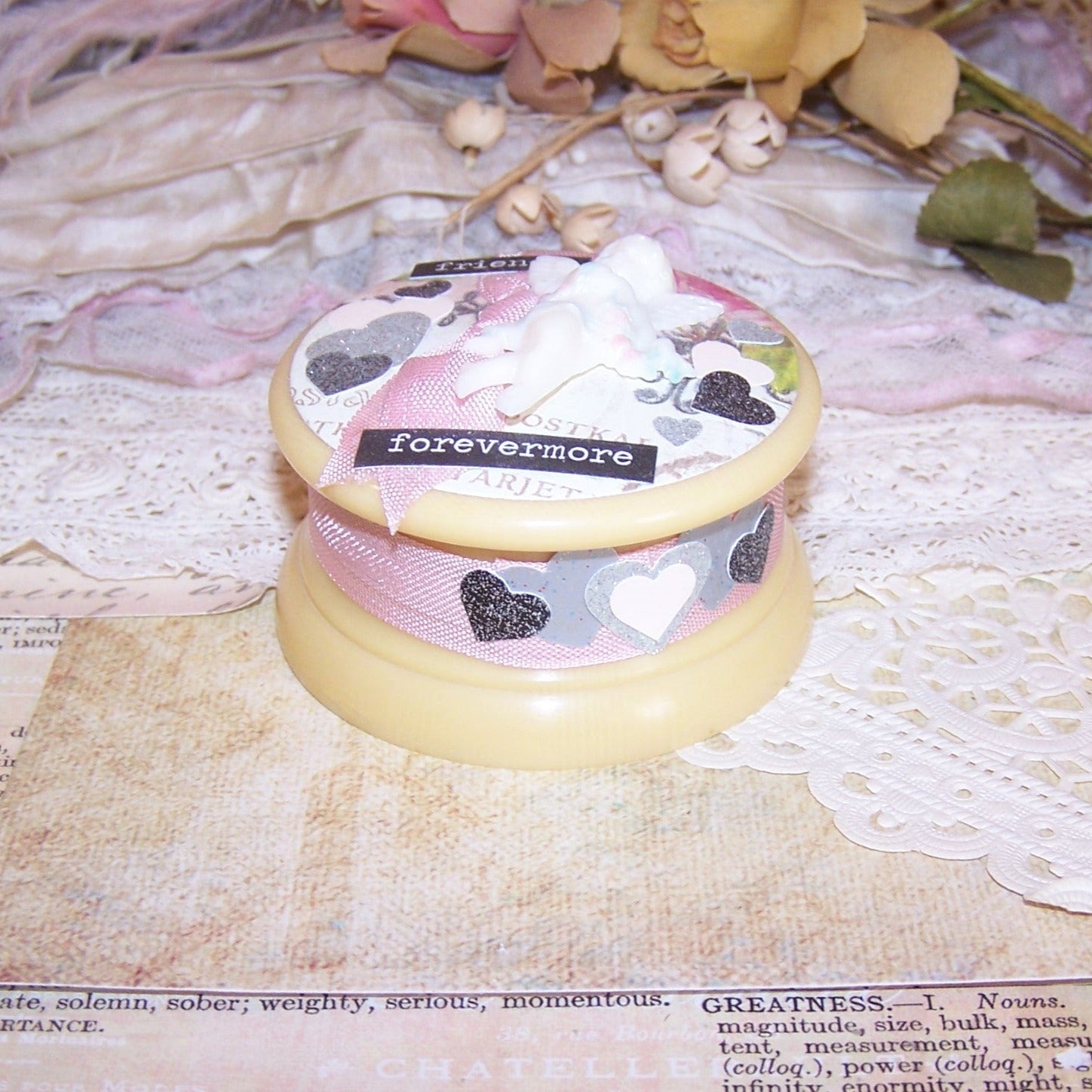 Dating to the 1930s or so (Art Deco period), I took a celluloid powder container (with lid) and added a bit more decoration - vintage paper, ribbons and a hand tinted plastic cherub. The top is entitled "friends forevermore" and it is adorned with pink and silver hearts. For yourself or a friend. Height is 1-3/8"; width is 2-5/8". Celluloid is in very nice condition with no stains or marks. Lid twists off easily and yes, the piece is decidedly femmy. I know my pics do not show the detail of the cherub but I don't think you will be disappointed. ONE OF A KIND!