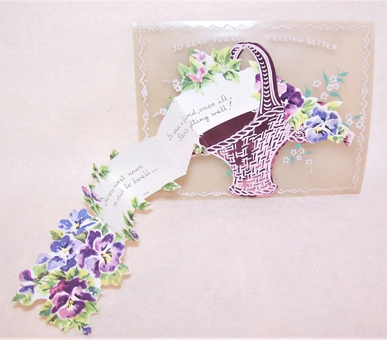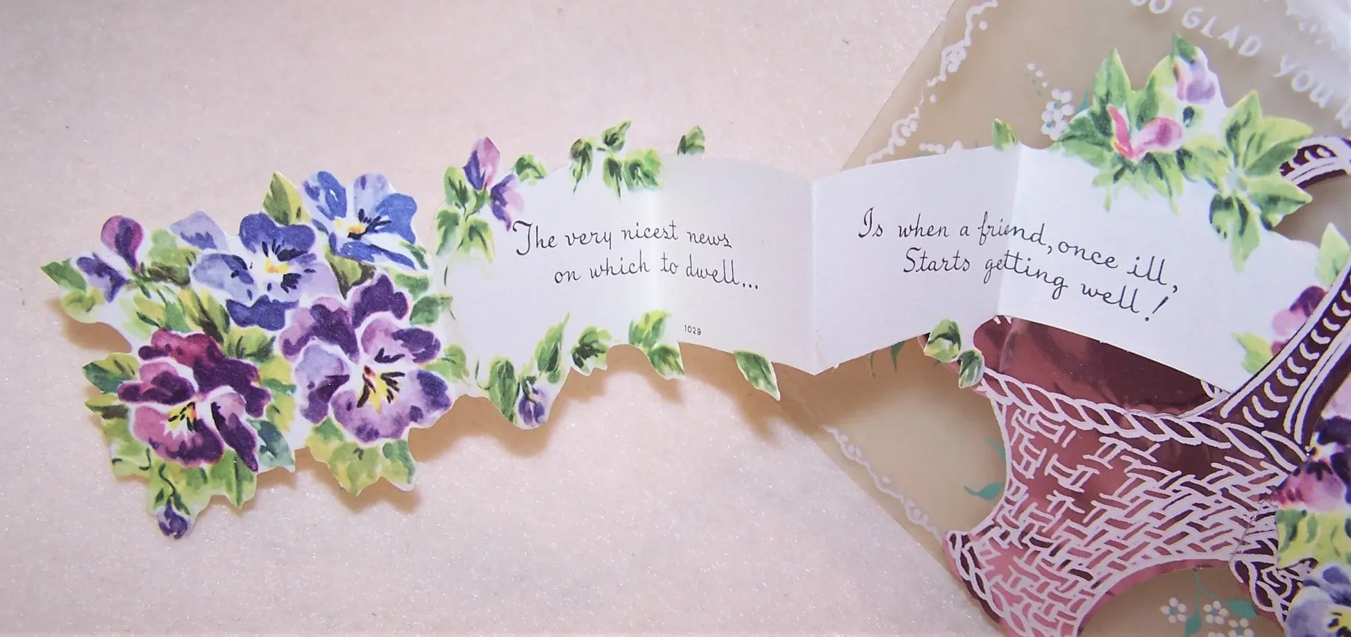 Dating to the 1960s or so, here's a colorful greeting card in 3 parts. First, the celluloid base has silk screened flowers as well as the sentiment - So Glad You're Feeling Better. Second, a pink aluminum foil basket with a silk screened texture. Third, the bouquet of purple and periwinkle pansies that spills out of the basket and contains, on the left side, a written sentiment. Unused condition with an overly large envelope (not pictured). Graphics are crisp and clean with high color - no stains, rips, tears, etc. Unknown maker. Size is 6" x 4-3/4".