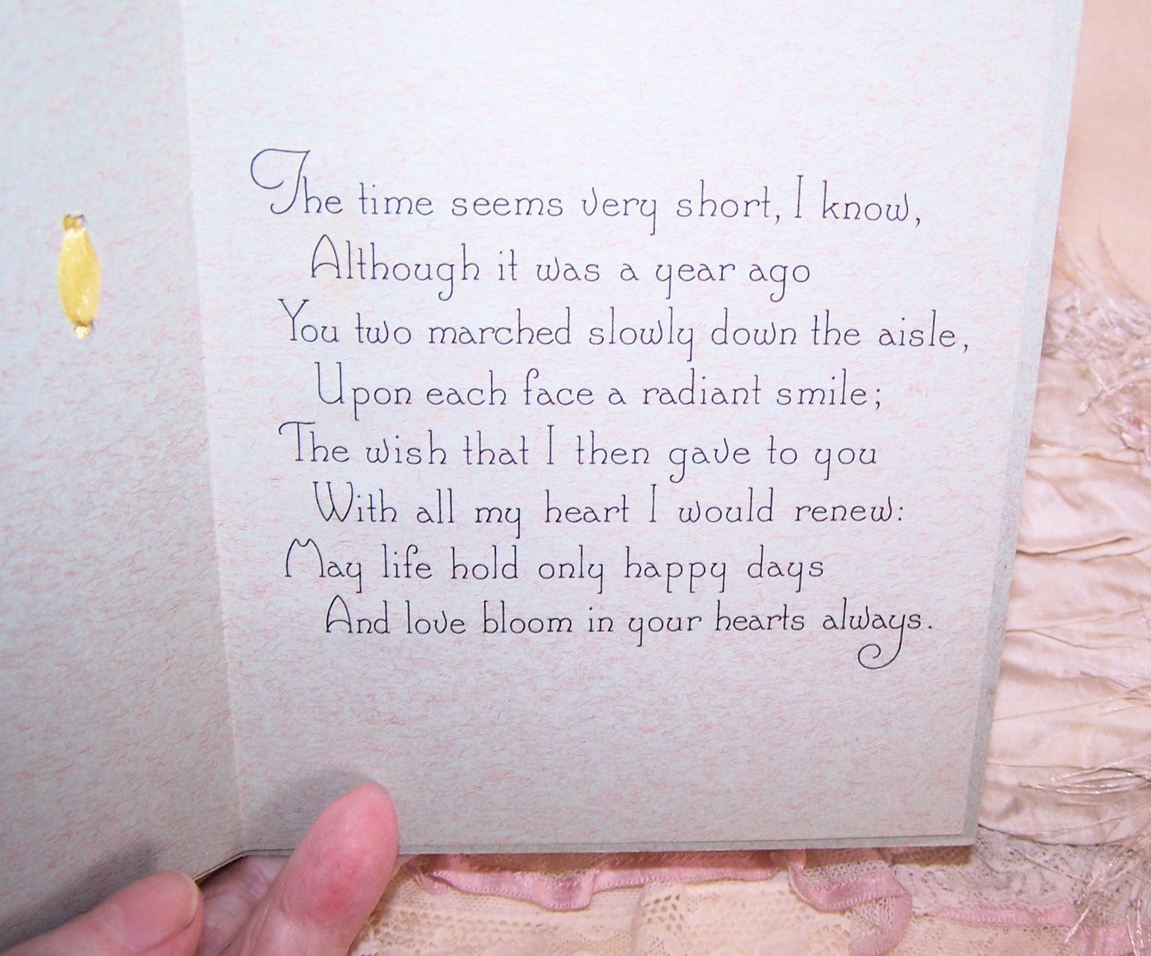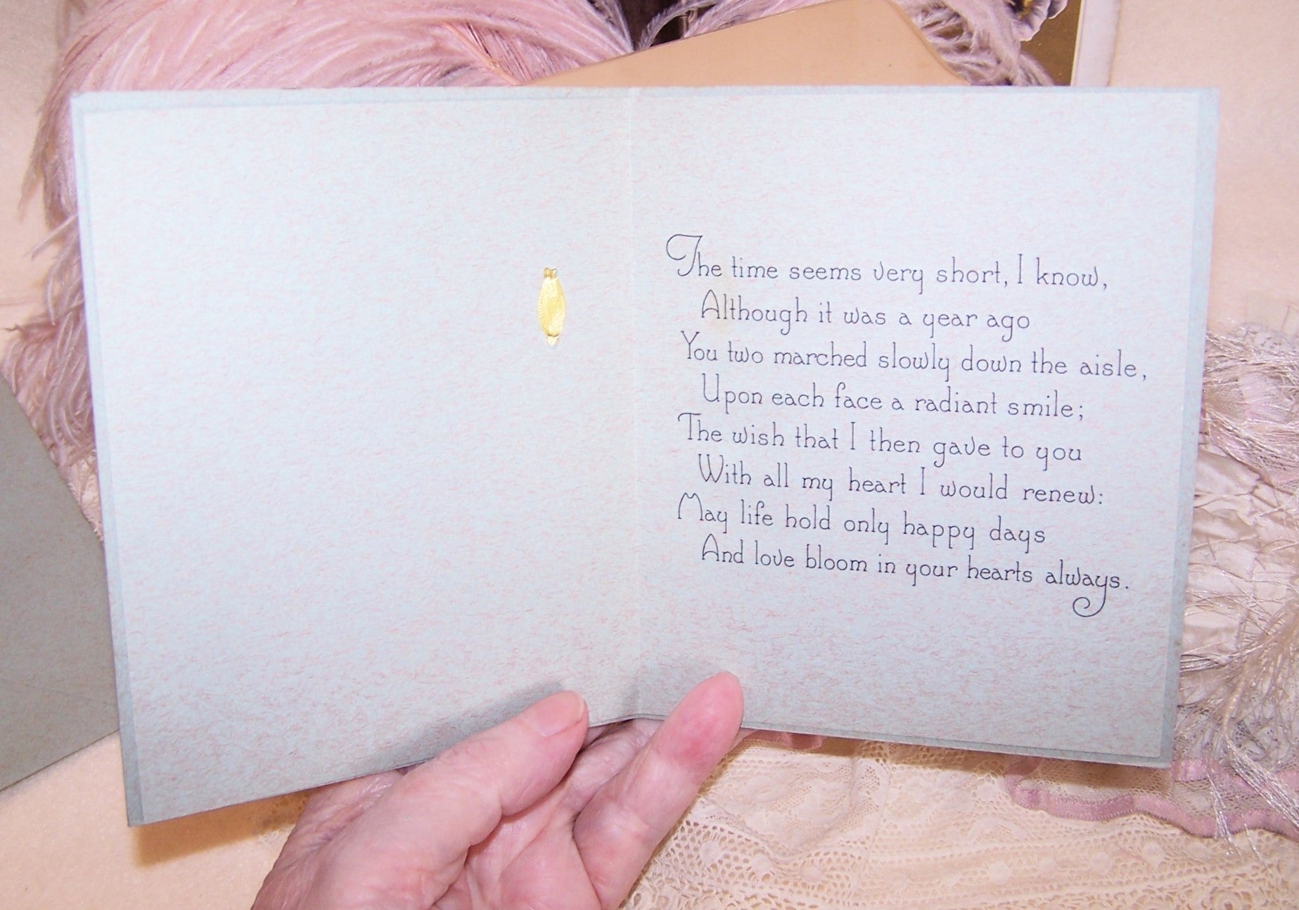 I just love Art Deco greeting cards! And when I find them in UNUSED condition, I am absolutely thrilled. The graphics and colors were always gorgeous and the one I offer now is no exception. Celebrating a First Anniversary, the front is floral in pale pastels - pink, lavender, green, blue and yellow. Size, when closed, is 4-1/2" x 5-1/4" approx. Original envelope is present but it is sealed shut - this from old age and possibly a damp basement - it will need to be steamed open or cut open and repurposed with another. A gorgeous card that I hope shows as well as it looks in person.
