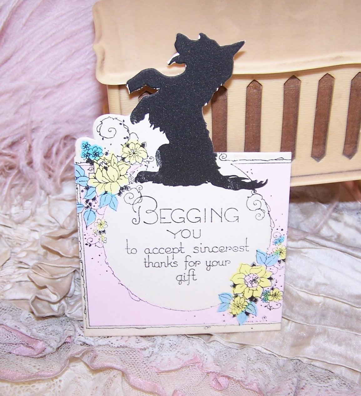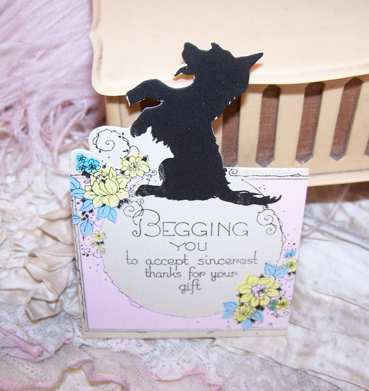 I just love Art Deco greeting cards! And when I find them in UNUSED condition, I am absolutely thrilled. The graphics and colors were always gorgeous and the one I offer now is no exception. 'Begging You to Accept Sincerest Thanks for Your Gift" is the sentiment to the front while the reverse is plain. The graphics to the front include a black terrier and lovely sprays of flowers both top and bottom. Coloring is pink, yellow, blue and black. Size is 3" x 4-1/4" approx. Original envelope is present and unfortunately it is sealed shut - probably due to being stored in a damp basement for a long time. A steam might open it up but I don't know for sure. Lovely overall condition with no problems to the card I can spot. Just adorable!