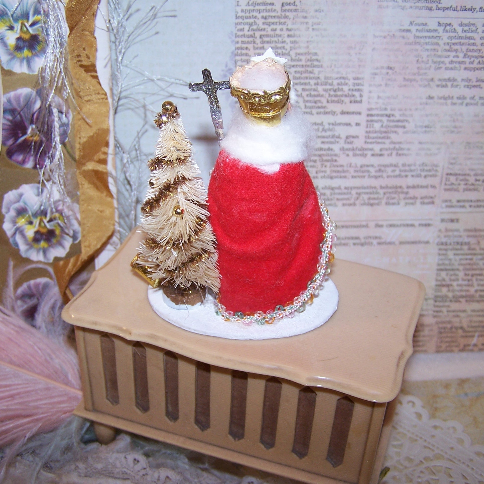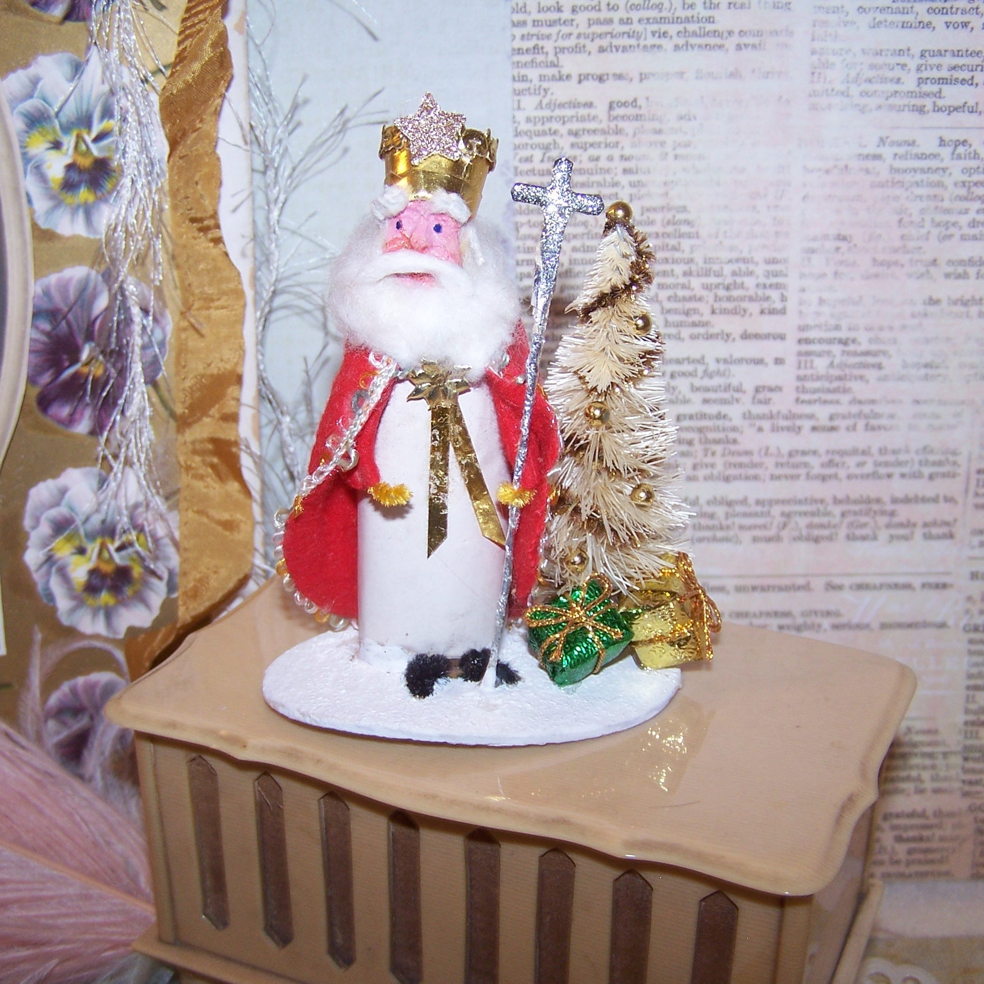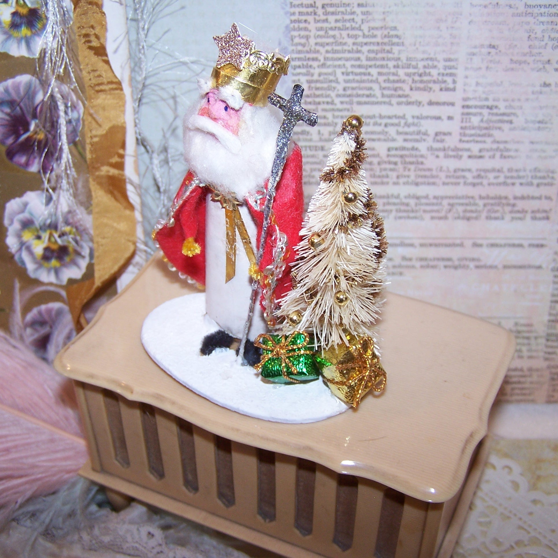 Pere Noel stands on a cardboard base covered in white mica glitter. The main body is glossy white paper and his cloak a cotton like fabric. The crown is gold paper as well as the bow on his clothing. The arms are chenille and the staff is a combo of metal and foil wrapped metal along with some applied silver glitter. The face is clay and the beard / hair or overly large collar is cotton batting. Since this piece was found in his original box, he would be considered as NEW UNUSED although he does show signs of a Japan "make as quick as you can" manufacture. My upcycling included reinforcing the crown and adding a star, adding silver glitter to the cross to hold the foil covering firmly in place, adding a Christmas Tree to the base as well as 2 packages.