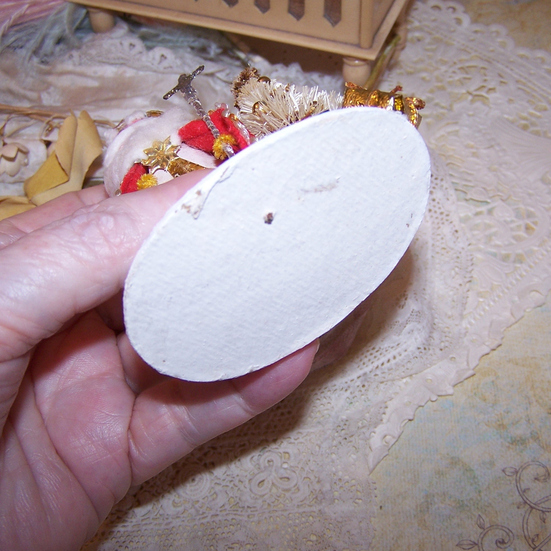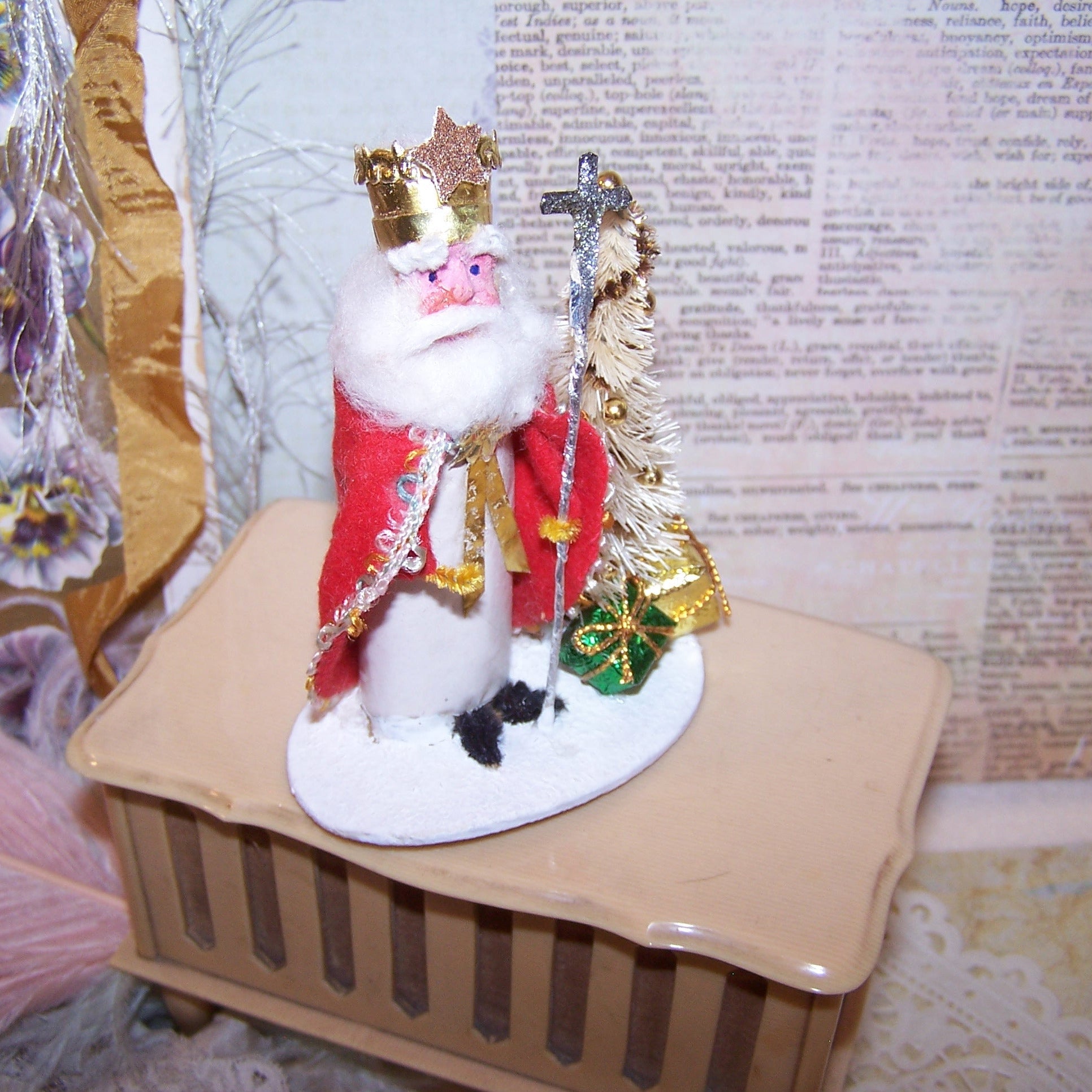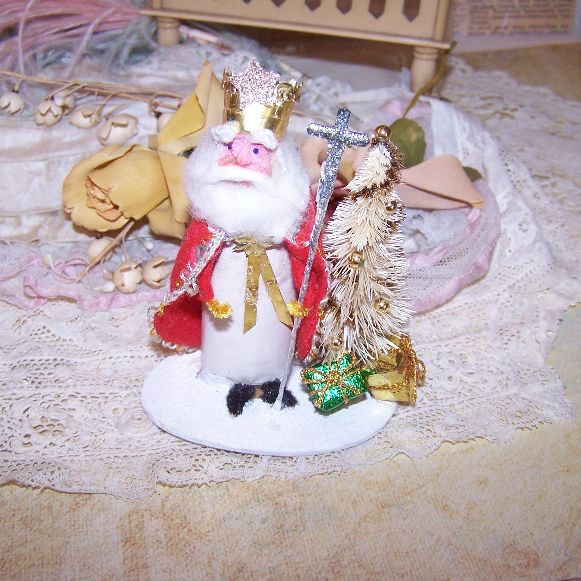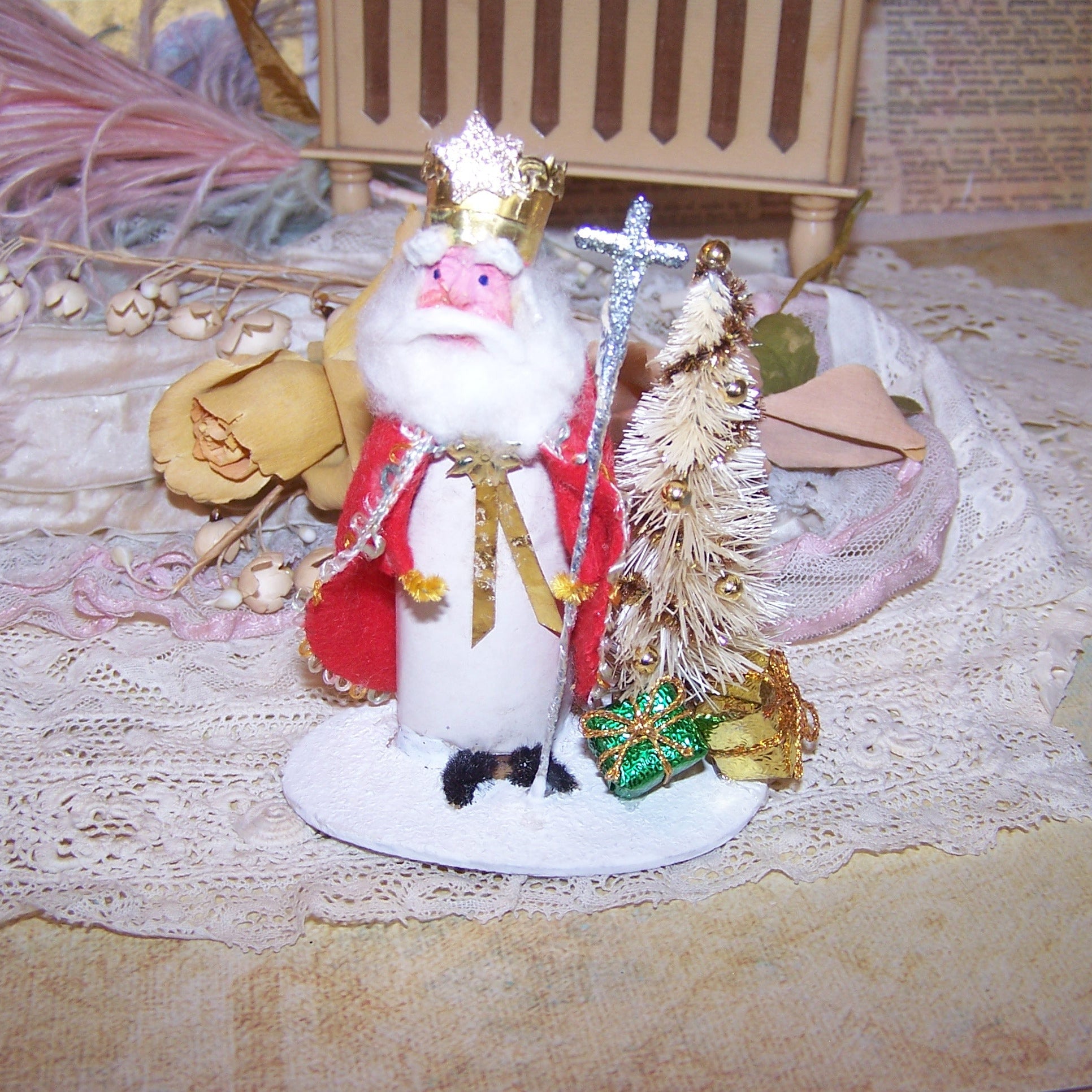 Pere Noel stands on a cardboard base covered in white mica glitter. The main body is glossy white paper and his cloak a cotton like fabric. The crown is gold paper as well as the bow on his clothing. The arms are chenille and the staff is a combo of metal and foil wrapped metal along with some applied silver glitter. The face is clay and the beard / hair or overly large collar is cotton batting. Since this piece was found in his original box, he would be considered as NEW UNUSED although he does show signs of a Japan "make as quick as you can" manufacture. My upcycling included reinforcing the crown and adding a star, adding silver glitter to the cross to hold the foil covering firmly in place, adding a Christmas Tree to the base as well as 2 packages.